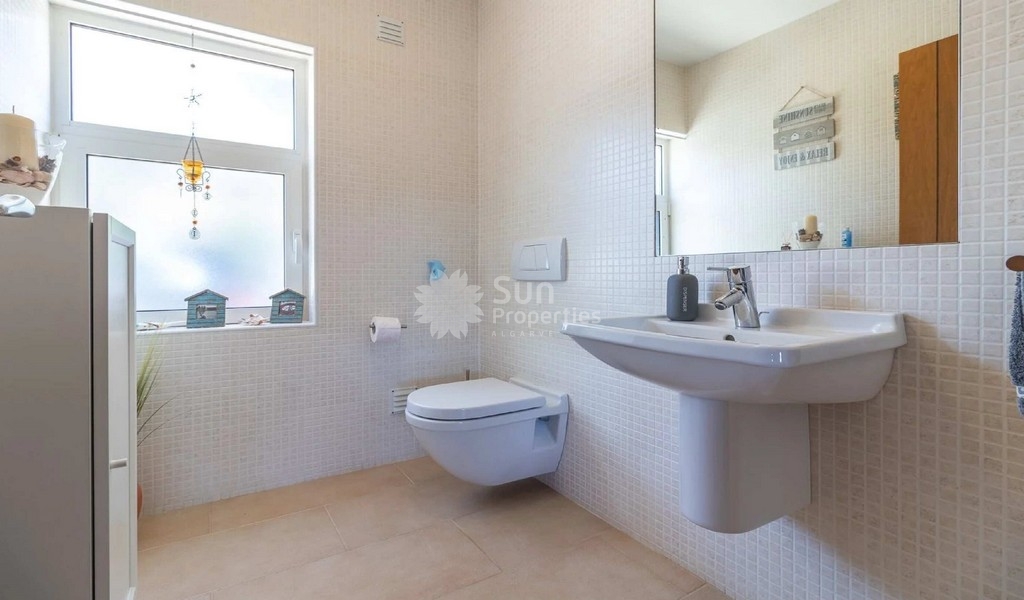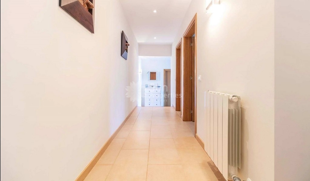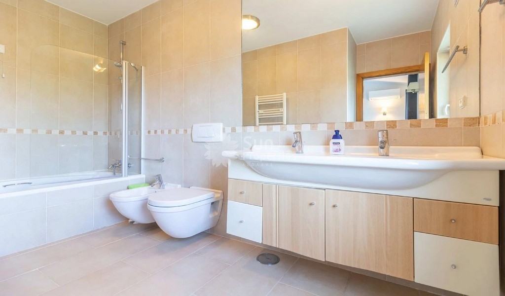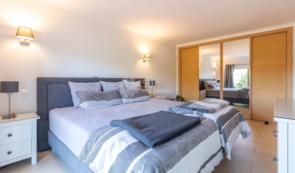 In the lower plan, we find 3 spacious bedrooms with fitted wardrobes that share the fantastic golf view. The ensuite room has a bathroom with bathtub and natural light and the other rooms share a large bathroom with shower. We also found a spacious storage room and all rooms have access to the garden.